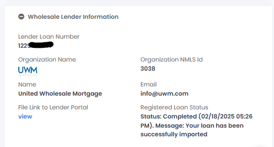 - Once the loan is successfully registered a loan number will be returned, the status in the wholesale lender info section will say Completed, and a view option will be available if you wish to be directed to the UWM portal. See screenshot below